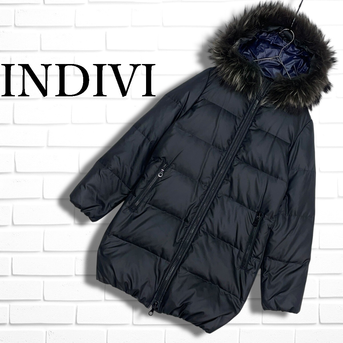 > ◆良品◆ INDIVI インディヴィ リアル ファー ゆったり♪ フーディー ダウン コート 黒 ブラック レディース 38 M ◆送料無料◆ 6705J◇
