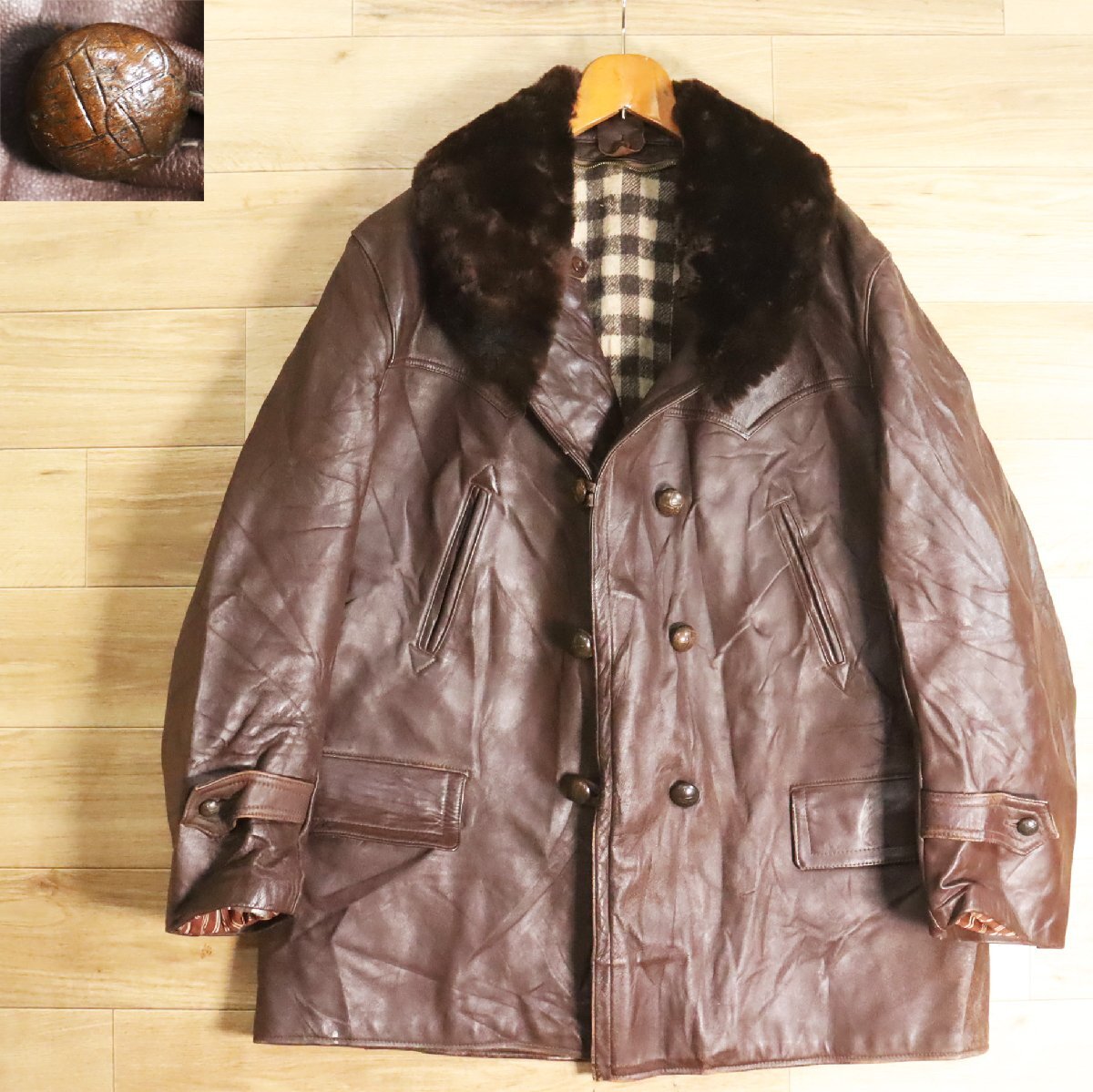 > J8O/Y5.16-2 70s~ マッキーノコート レザージャケット 本革 ダブルブレスト 襟ボア 裏チェック 革コート 皮コート レザーコート