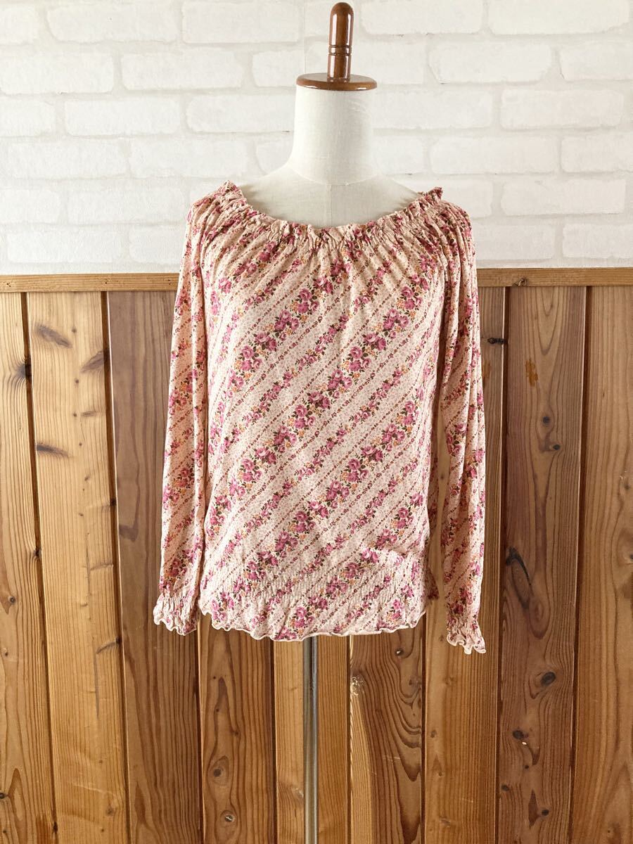 > OZOC レディース 長袖 小花柄 カットソー 38 Mサイズ ピンク ベージュ メロウリブ チュニック オフショルダー トップス フェミニン ⑪