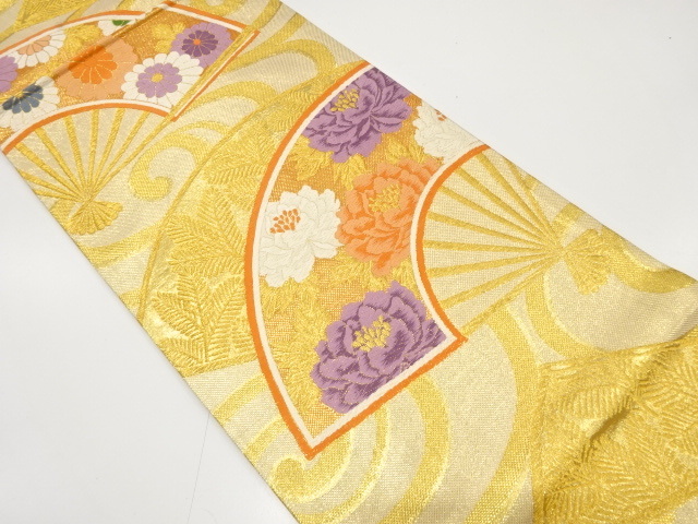 > 美品 佐賀錦 流水に扇・牡丹・菊模様織り出し 袋帯 (AAG1K-006)