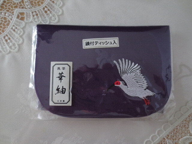 - 日本製・華紬・鏡付 ティッシュケース・紫・鶴