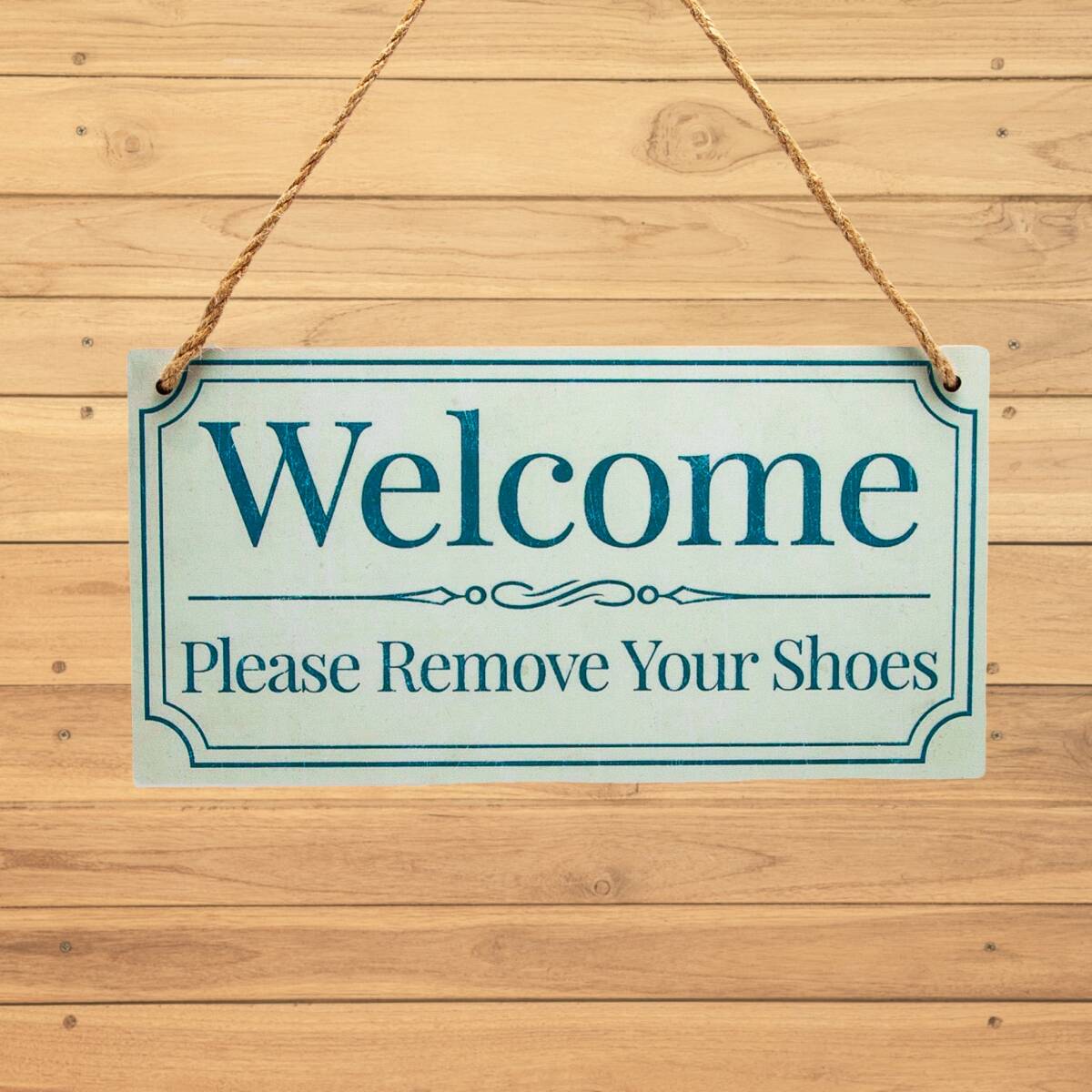 > ウッド合板 壁飾り サインボード WELCOM Please Remove Your Shoes 12.5㎝×25㎝ 掛け紐付き 新品