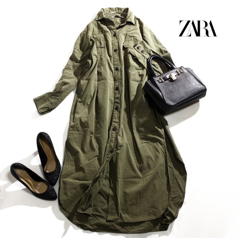 > ZARA ザラ シャツワンピース ロング丈 長袖 ワンピース XS S 羽織りにも◎ カーキ グリーン 緑 マキシ丈 マキシワンピース しっかり生地
