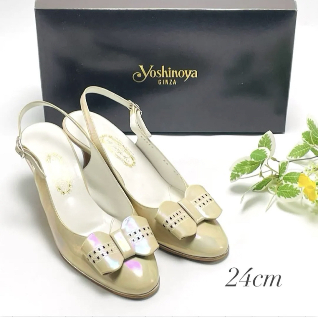 - 日本製 GINZA yoshinoya パンプス スリングバック バックストラップ エナメル リボン 24cm ベージュ系 ハイヒール レディース