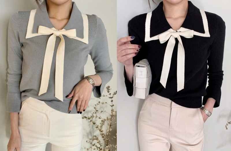 - ニットトップス 厚手 長袖 ニットセーター トップス リボン かわいい カジュアル シンプル 秋冬 フリー ブラック