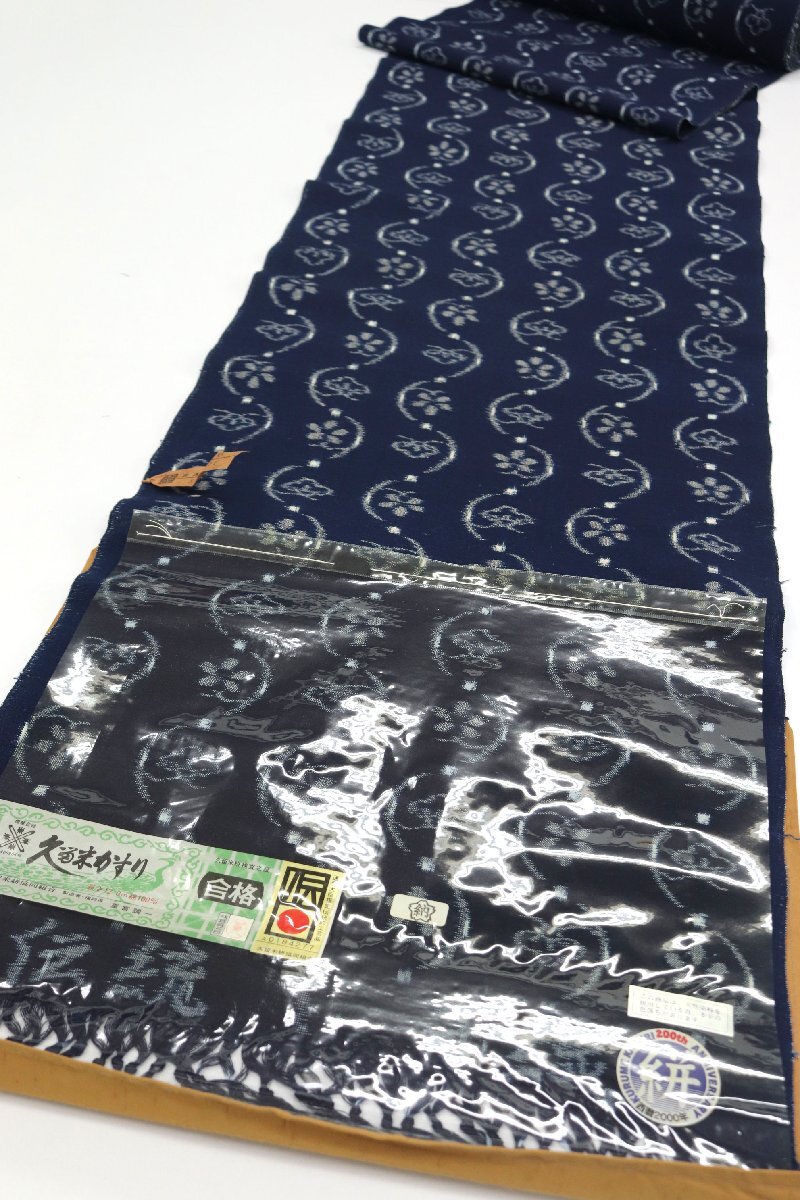 ※こちらの商品にはお仕立てはついておりません。 (布幅:37cm 長さ:12m) 久留米かすり着尺をご紹介致します。 しっかりとしたハリのある綿の生地は、濃紺色のお色目でございます。 全体には、白色で松や花の絣模様が織り上げられております。 素朴な綿の風合いが特徴の久留米絣をお手に取っていただき、是非その良さをお確かめいただきたく存じます。