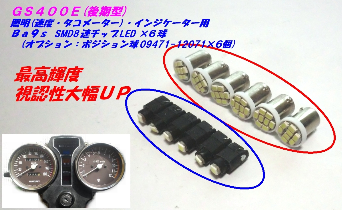 > ◆決定版!最高輝度! SMD8連チップLED メーター インジケーター Ba9s×6個セット ☆1/ 09471-12071ポジション球追加OK/GS400E/後期型/