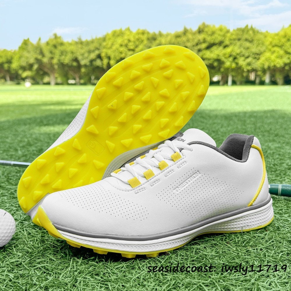 - 絶賛◆新品 ゴルフシューズ 通気性 スポーツシューズ メンズ 男女兼用 運動靴 耐久性 スニーカー フィット感 防滑 耐磨 白*黄 24.5cm