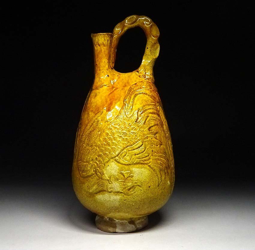 > 緑屋t■ 中国古玩 黄釉 陽刻 皮嚢壺 鶏頭壷 水注 鳳凰紋 唐物 時代物 i9/10-6485/6-2#80