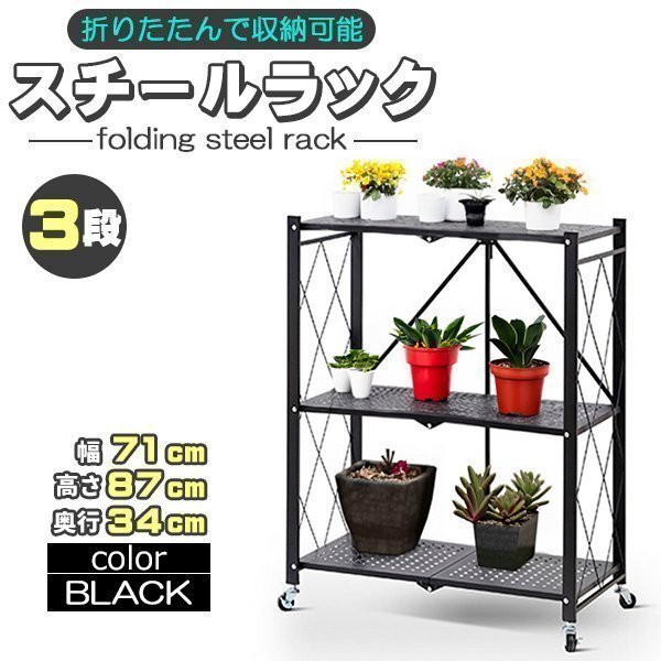 - 収納ラック 棚 金属シェルフ スチールラック メタルラック 折りたたみ 折り畳み スチール棚 キャスター付 組立簡単 頑丈 ブラック 黒 3段