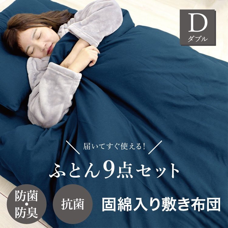 - 布団セット ダブル 9点セット 洗える 敷布団 掛布団 枕 抗菌 防臭 防カビ ほこり 出にくい カバー 来客用 収納袋付 寝具 ふとん ネイビー