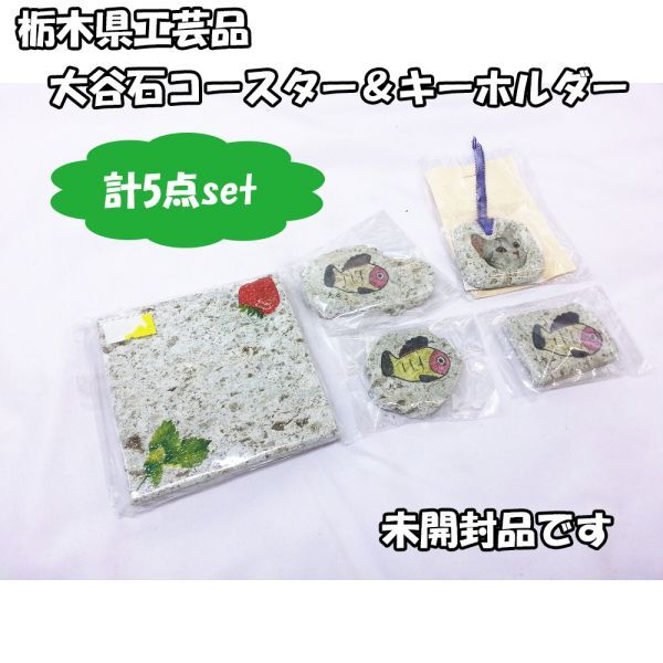 - 01112 【未開封品】栃木県工芸品 大谷石のコースターとキーホルダーなど 計5点セット インテリア小物 大谷石体験館 宇都宮 猫 きぶな