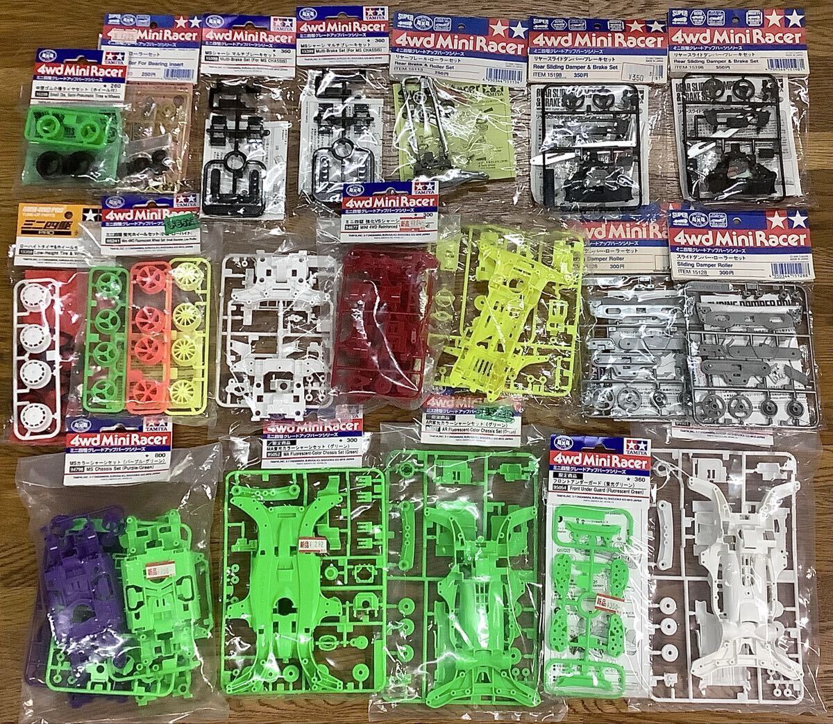 > ミニ四駆パーツ MSカラーシャーシセット(パープル グリーン) AR強化シャーシ(ホワイト) フロントアンダーガード(蛍光グリーン)他 計19品