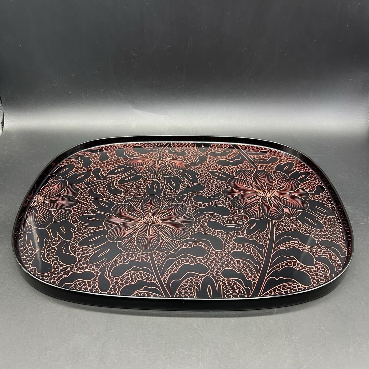 - 牡丹彫 トレー トレイ 盆 お盆 漆器 フ14-4