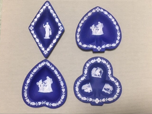 - ◎1930年代 ウェッジウッド ロイヤルブルーを被せた白のジャスパー トランプ柄形プレート4種セット◎