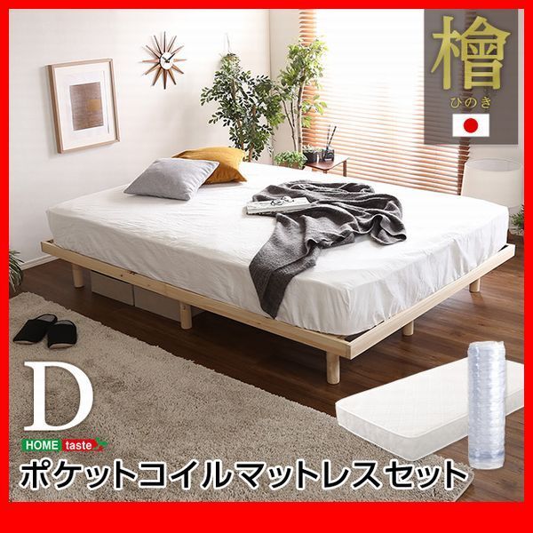 - すのこベッド★3段階高さ調整 総ひのき脚付きすのこベッド ポケットコイルマットレス付き ダブル/国産檜無垢材 低ホルムアルデヒド/限定/zz