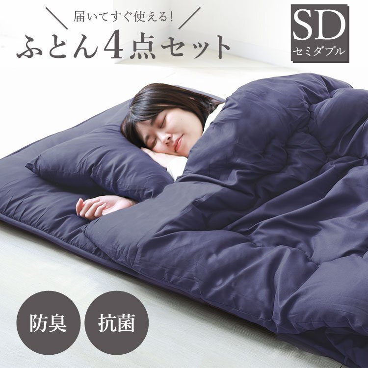 - 布団セット セミダブル 4点セットふとんセット 固綿入り 洗える 敷布団 掛布団 枕 抗菌 防臭 防カビ カバー 来客用 収納袋付 寝具 ネイビー