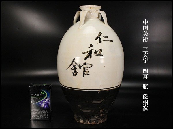 - 【金閣】中国美術 三文字 四耳 瓶 高29cm 磁州窯 旧家蔵出 送料無料(YB865)