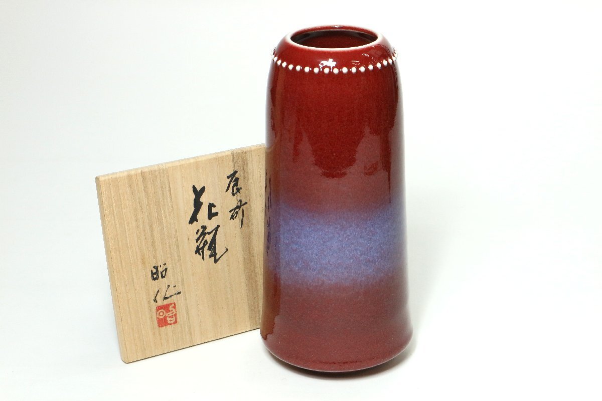 ・山崎昭 辰砂 花瓶 25cm 共箱 /花器 花入 花生