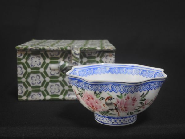 - 煎茶碗 ぐいみ 中国景徳鎮製 花鳥文字碗 箱 【送料無料】