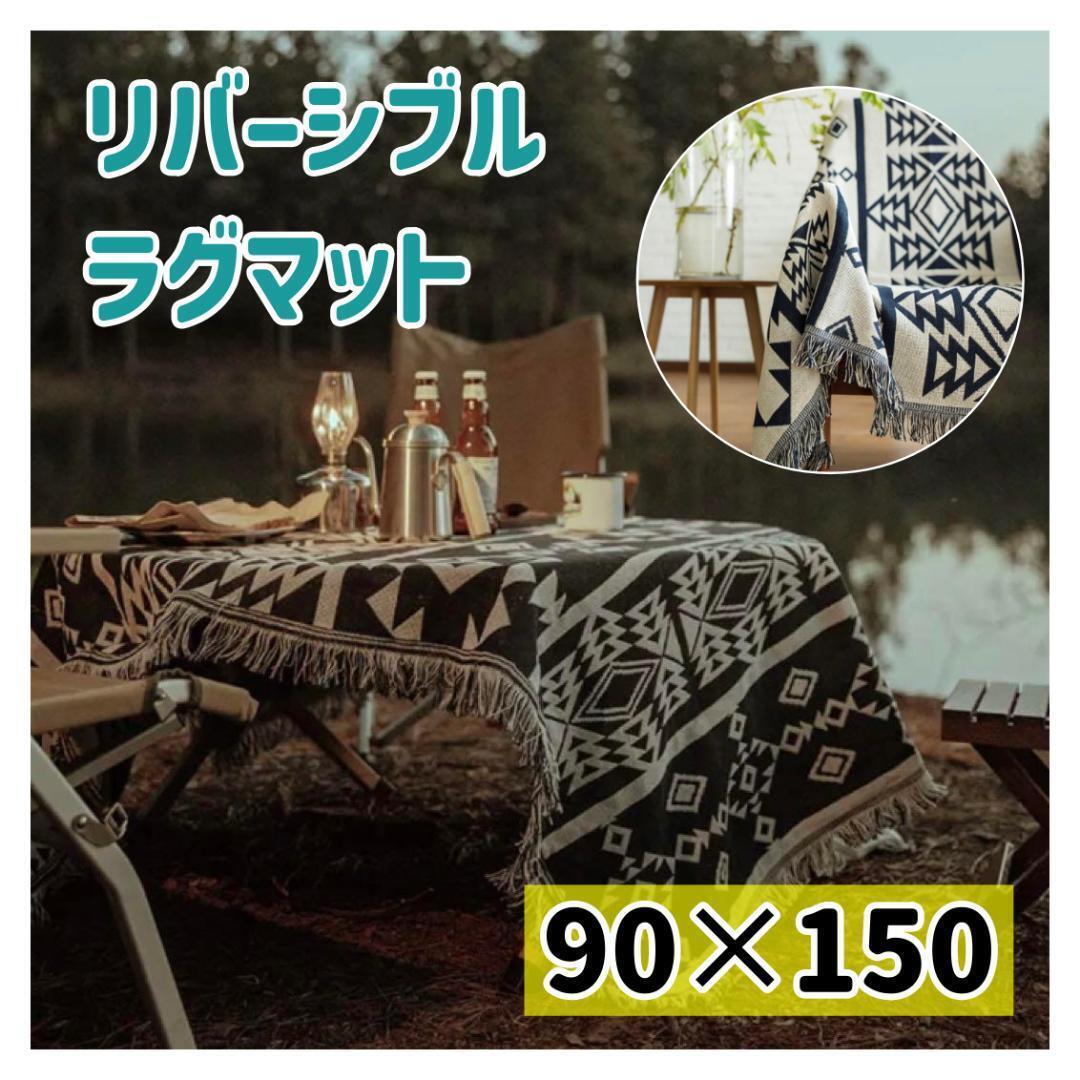 - 【90150】ラグ ラグマット アウトドア マルチカバー リバーシブル 黒白 テント用 ット用ラグ キャンプ ラグマット オルテカ柄 キリム