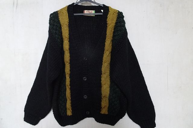 > ITALIA/長袖カーディガン/アクリルニット素材/深Vネック/前ボタン/ケーブル編/からし色・深緑配色/黒/ブラック/フリーサイズ(11/18R7)