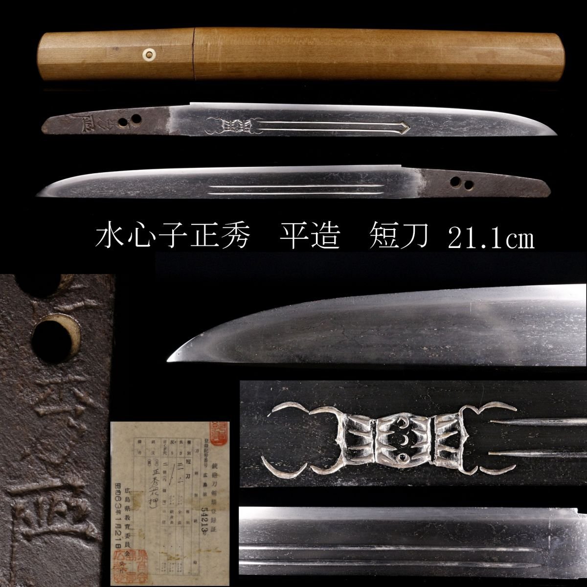 - 【LIG】水心子正秀 平造 短刀 21.1㎝ 白鞘 三鈷柄剣彫刀身 花押 新々刀の祖 旧家蔵出品 [.QPT]25.7