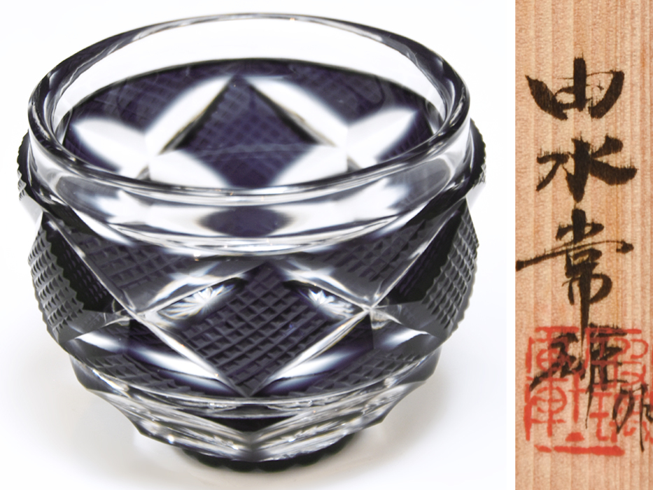 > 由水常雄 (造) 紫被せ ガラス切子 ぐい呑み 薩摩切子写 共箱 酒器 酒杯 酒盃 硝子 ガラス工芸 glass u1552a