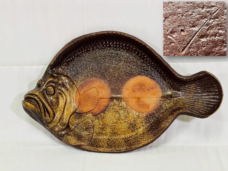 - 備前焼 西山寛山 特大ヒラメ大皿 幅55cm 魚皿 骨董 置物 飾物 日本伝統工芸品 時代物 在銘 飾皿 盛皿 変形皿 刻印 陶器 アンティーク