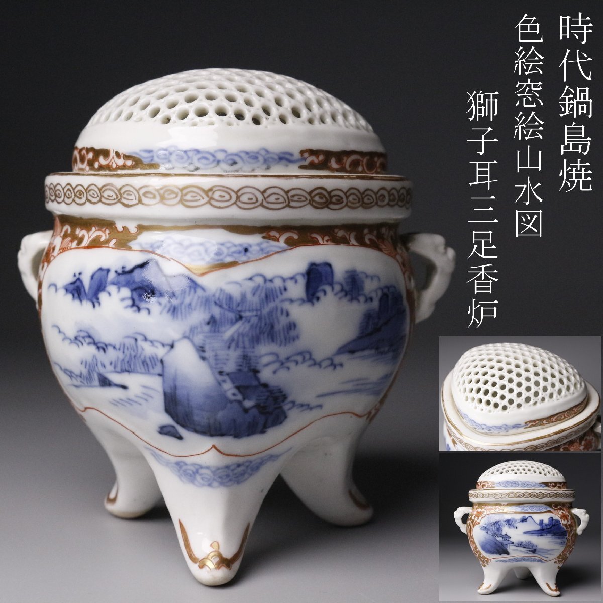 - 【LIG】時代鍋島焼 色絵 窓絵山水図 獅子耳三足香炉 香道具 古美術品 [.QQ]25.11