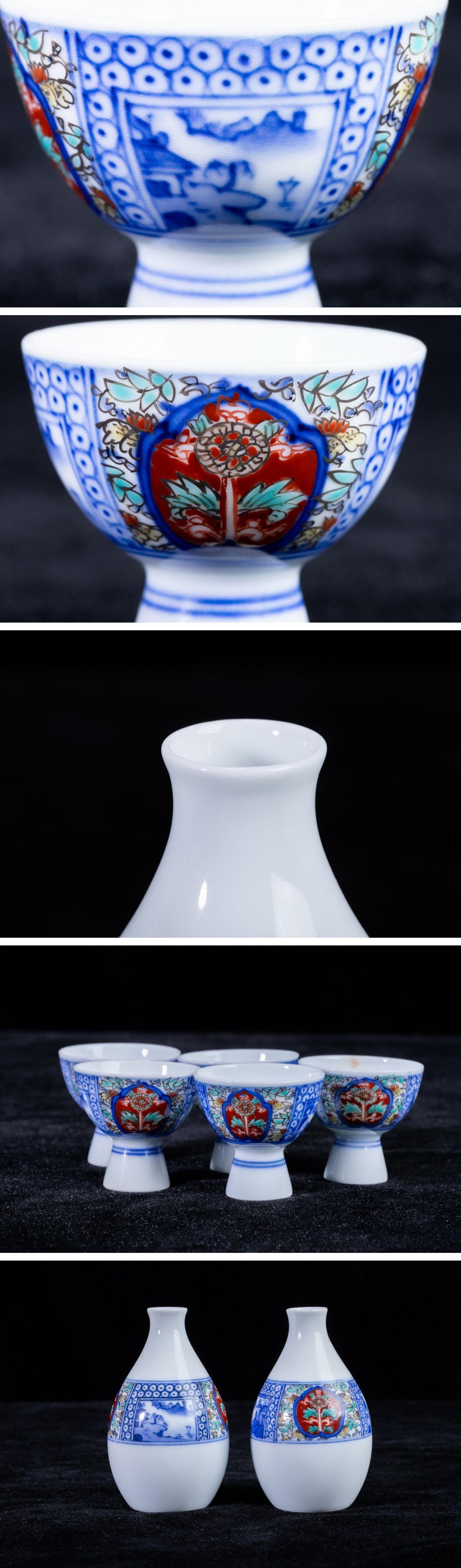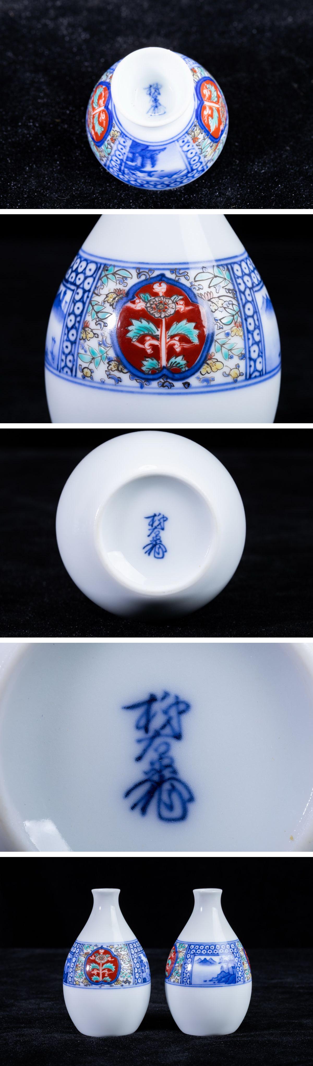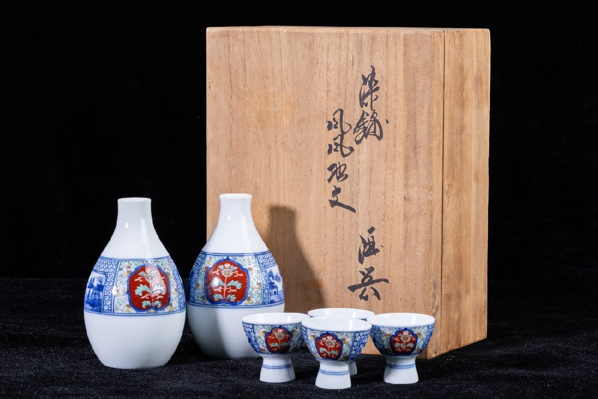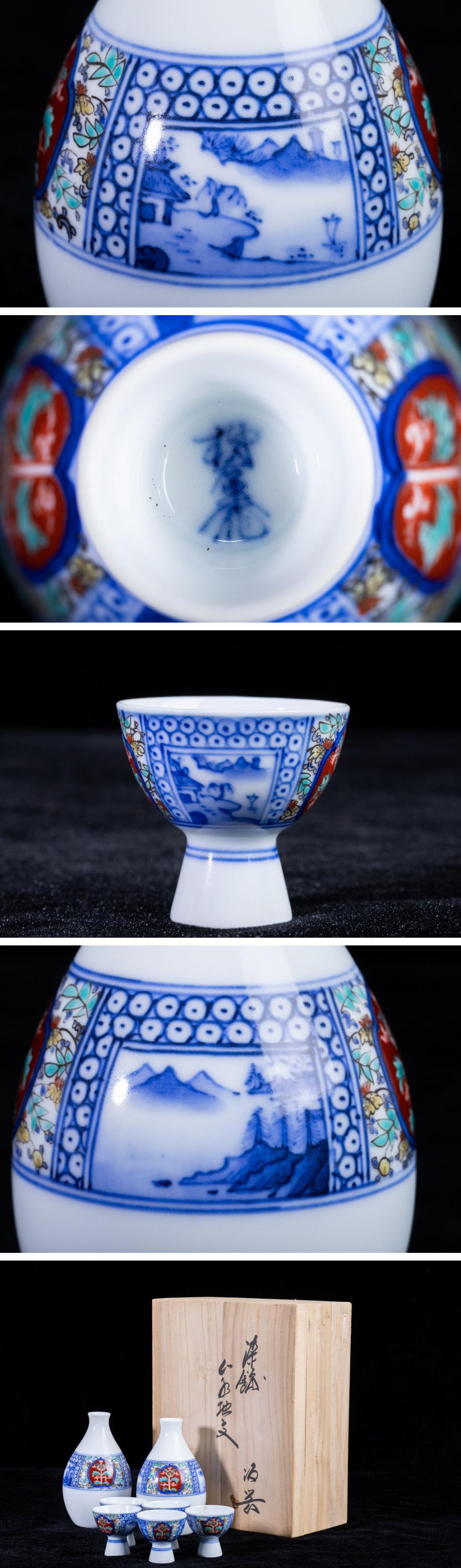 - 【珍品堂】1円から R77-V6 有田焼 十三代 酒井田 柿右衛門 在銘 山水地文 染錦 酒器 木箱 7点セット徳利 猪口 和食器 時代物 骨董品 古美術