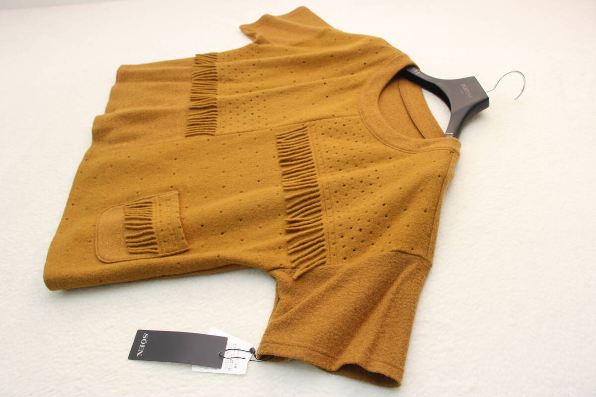 - 6902 新品タグ付き ウール混パンチングフリンジ半袖プルオーバー マスタード 定価¥29,700税込み