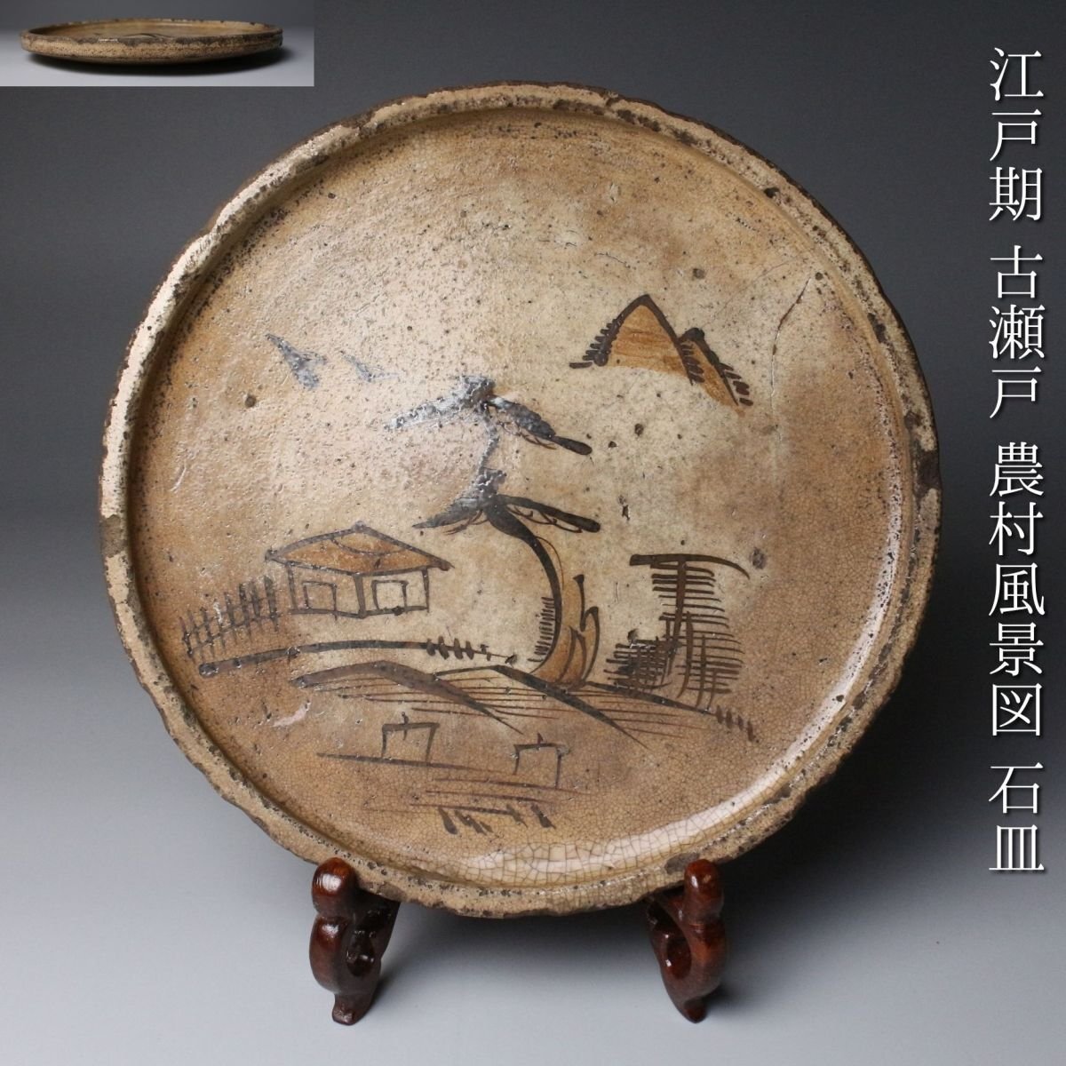 - 【LIG】江戸期 古瀬戸 農村風景図 石皿 美濃 織部 行燈皿 古美術品 コレクター収蔵品 [.U]25.10