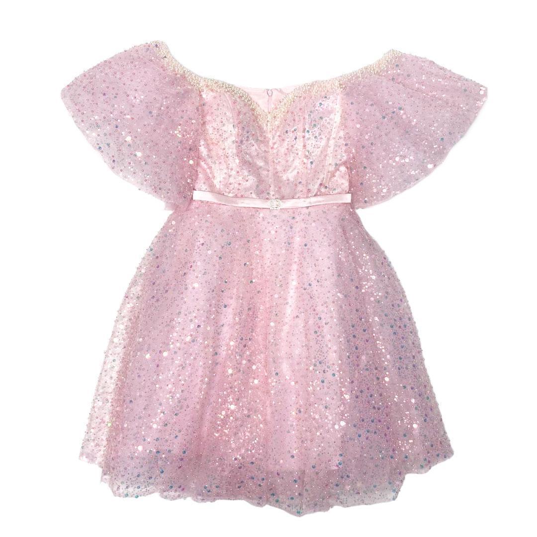 - デコルテパール装飾 オフショルダー スパンコール フレアミニドレス