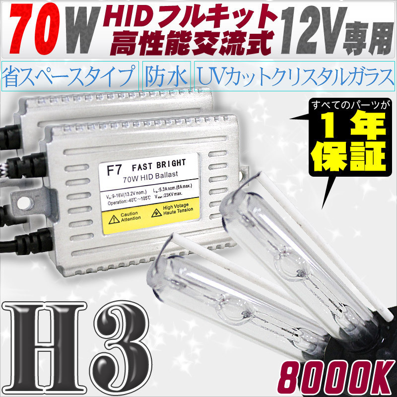 > 高性能 HIDキット 70W H3 リレー付 8000K 【交流式バラスト&クリスタルガラスバーナー】 12V用
