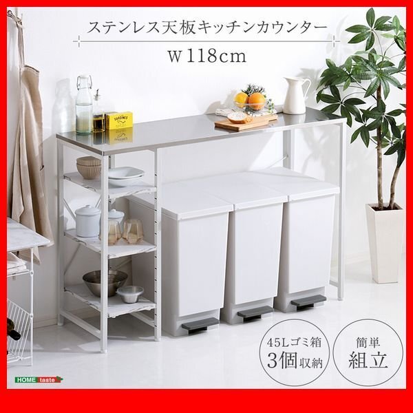 > キッチンカウンター★新品/水 油 汚れに強く 清潔感があり 衛生的な ステンレス天板キッチンカウンター/幅118cm 可動棚/人気の白家具/zz
