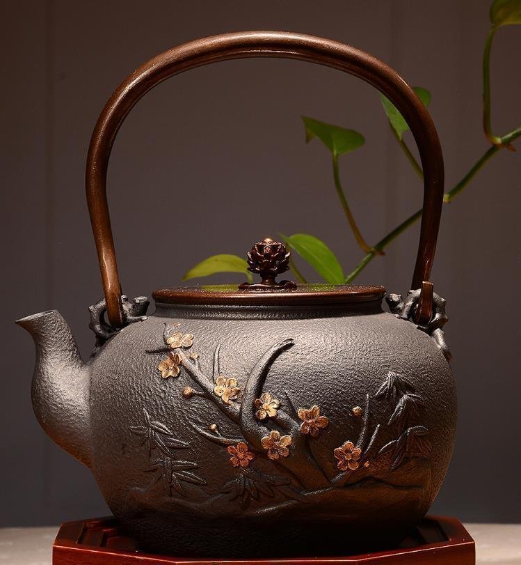 - 新入荷★提梁鉄瓶 手作り コーティングなし やかんを沸かす 老鉄瓶 梅蘭竹菊 お茶の道具 1.2L 鉄瓶