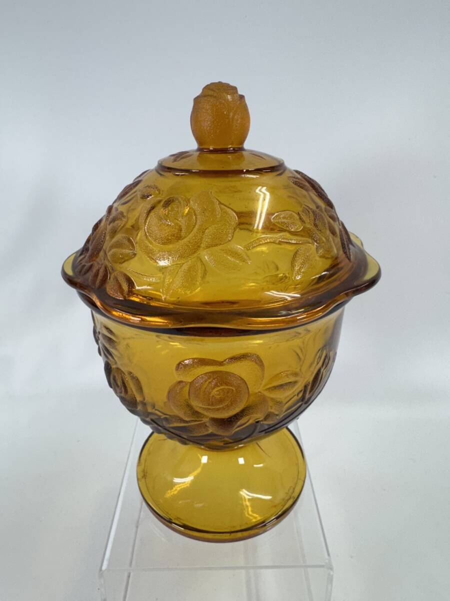 > 【超美品】 昭和レトロ 琥珀色 キャンディポット 工芸ガラス 花模様 小物入れ 蓋付 ヴィンテージ 琥珀 ガラス