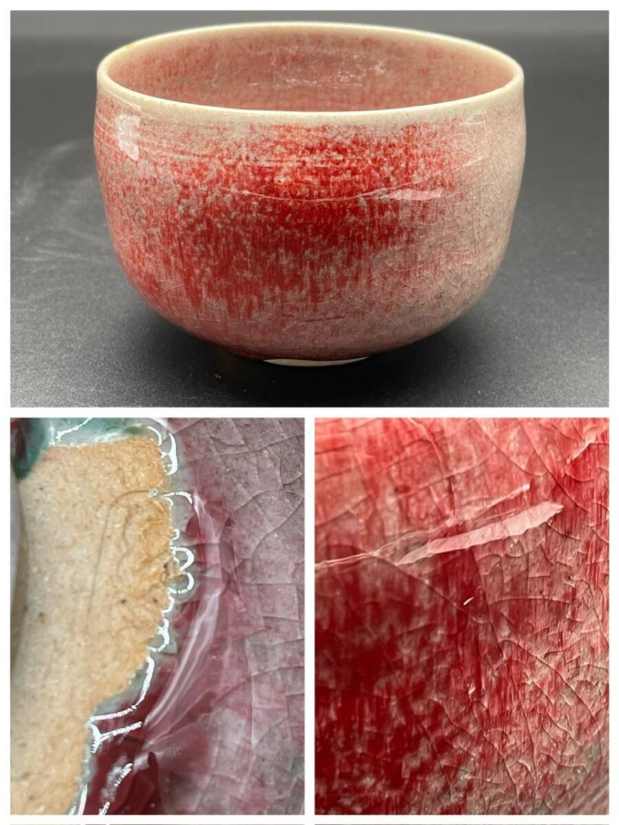 - 作家物 辰砂釉茶碗 在銘 直径11×高9㎝ 382g 茶道 抹茶 抹茶茶碗 茶碗 茶道具 煎茶 煎茶道具 陶器製茶碗 (20348)