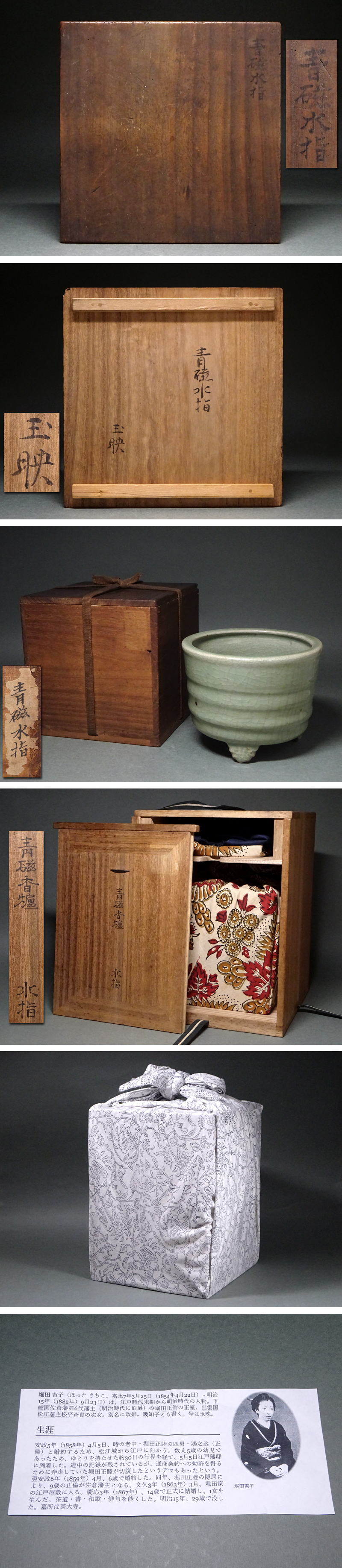 > 慶應◆下総国佐倉藩第6代藩主堀田正倫正室【堀田吉子(号:玉映)】書付時代箱入 中国明代末期 龍泉窯七官青磁大香炉 水指 漆蓋添 唐物茶道具