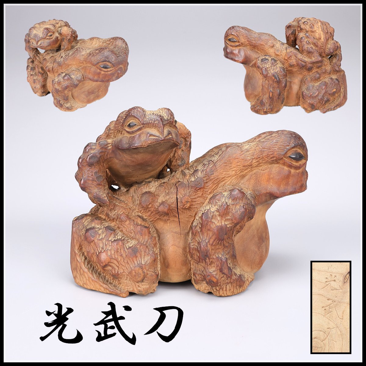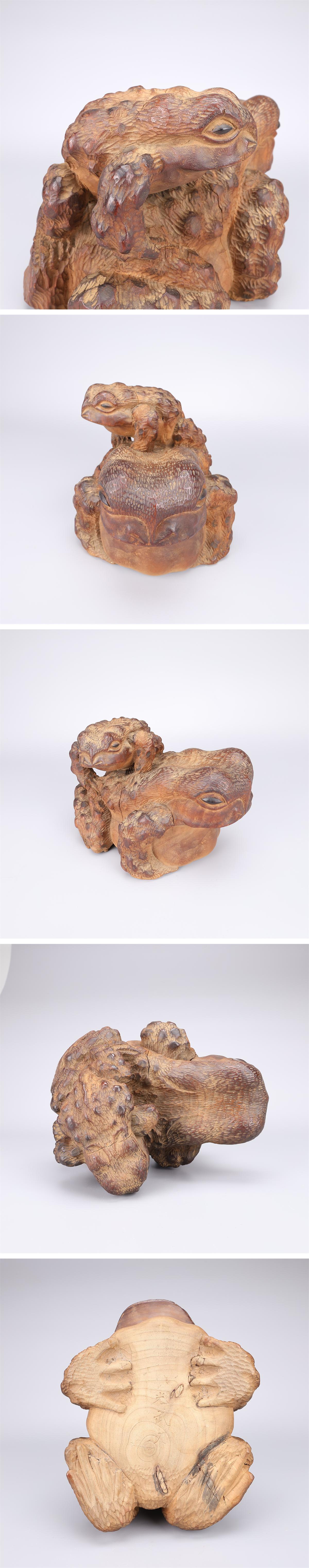 【吉】MB491 名工 【光武刀】 東洋彫刻 天然木製 木彫 親子蛙 カエル 置物 高17㎝ 幅24㎝拍卖