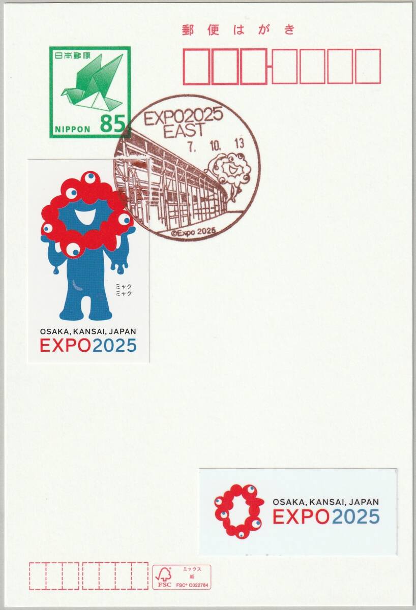 - 2025年 日本国際博覧会(2025大阪・関西万博)を記録するはがき◆EXPO2025 EAST郵便局/万博閉幕日・風景印押 ステッカー貼/令和7年10月13日