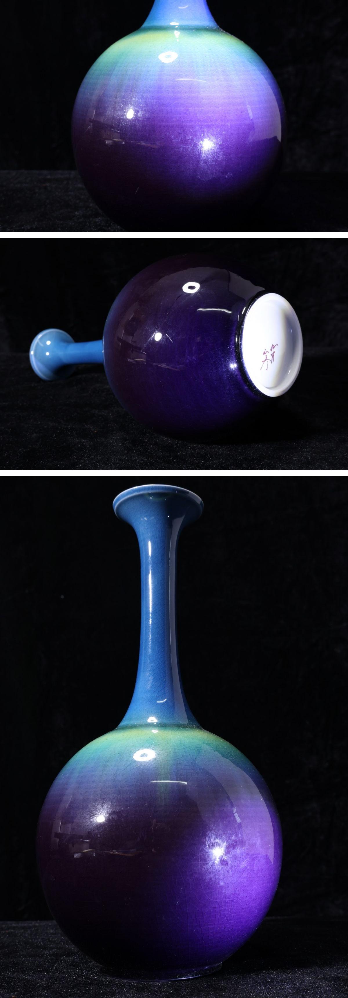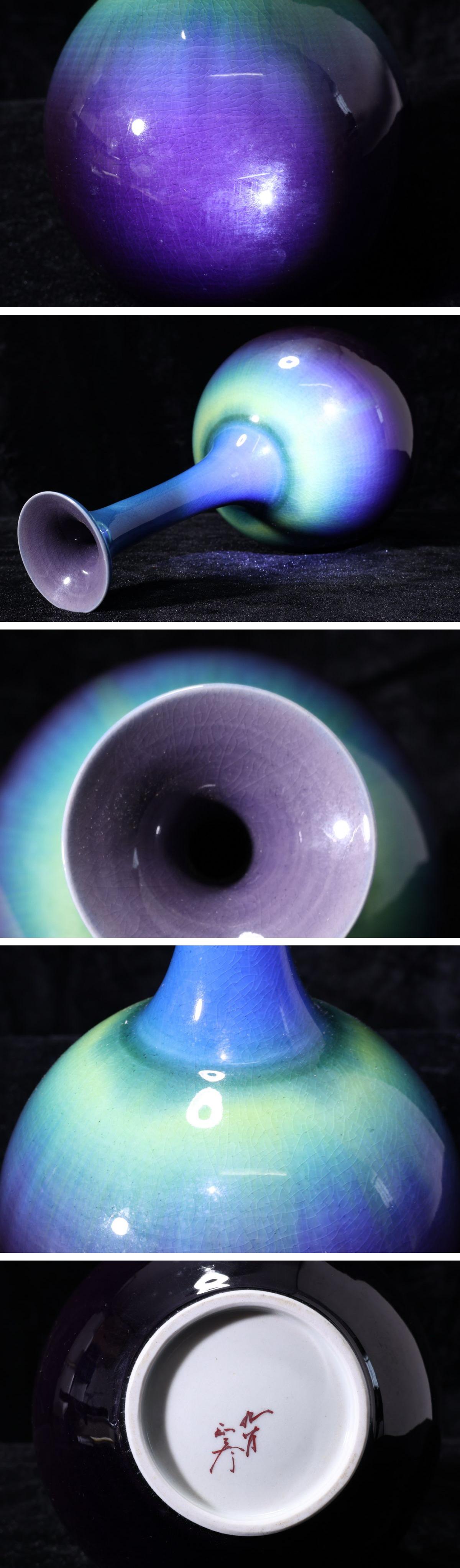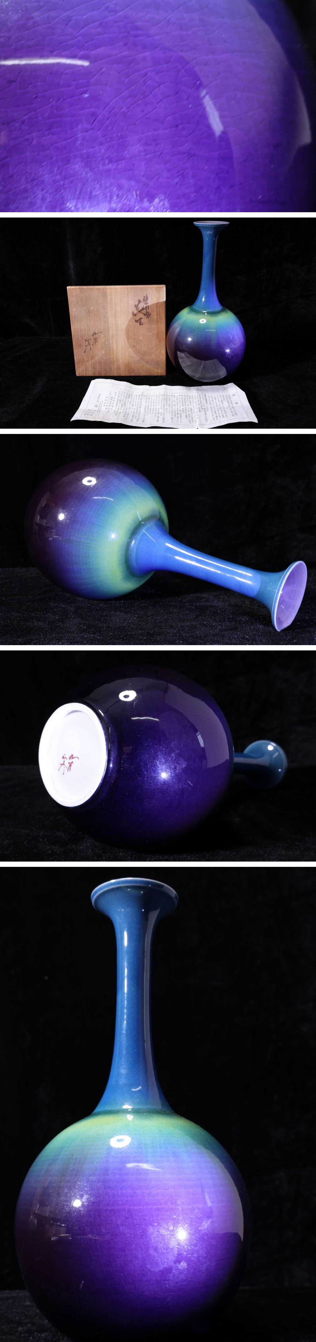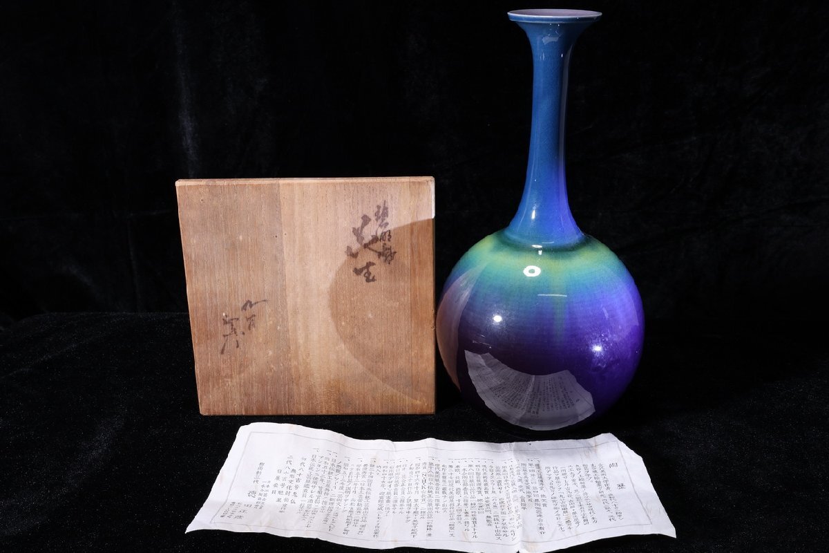 - 【珍品堂】1円から Q48-V10 人間国宝 九谷焼 徳田八十吉 徳田正彦 碧明釉 花瓶 高17.5cm 飾壺 共箱 木箱 時代物 工芸品 骨董品 古美術 希少