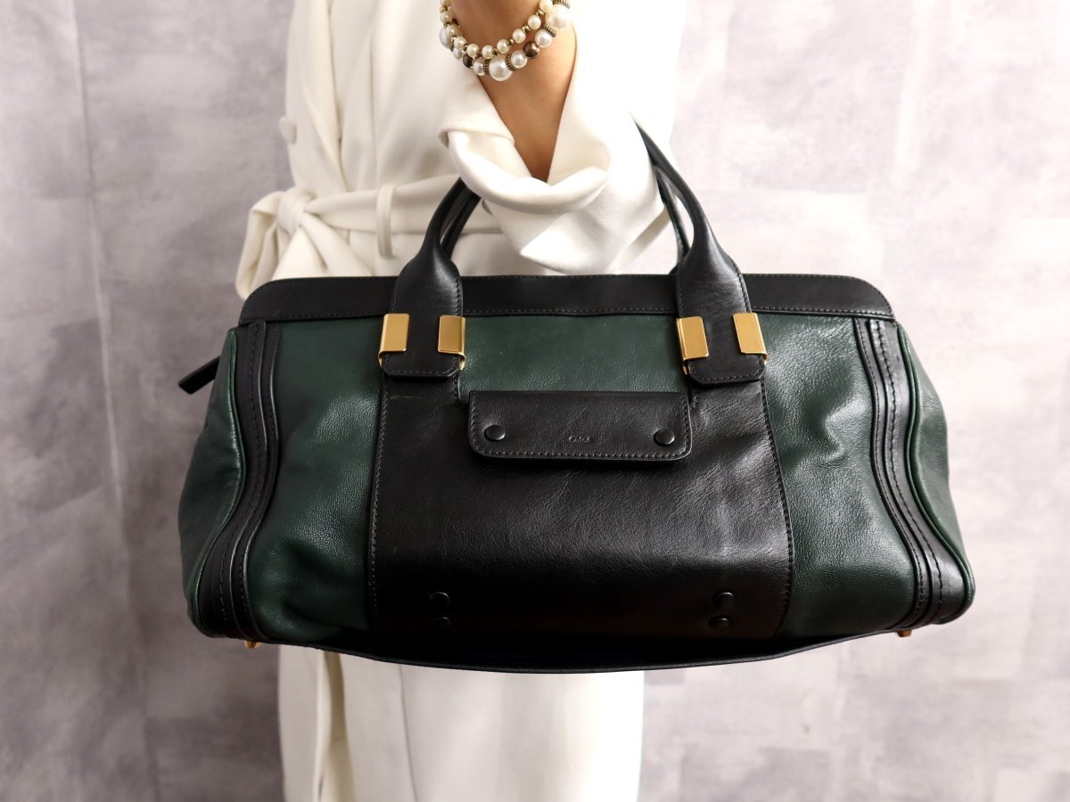- ●超美品●Chloe クロエ●アリス●バイカラー●カーフ レザー 本革●ハンド バッグ●黒 グリーン系●ゴールド金具●B5 収納 書類●Js62848
