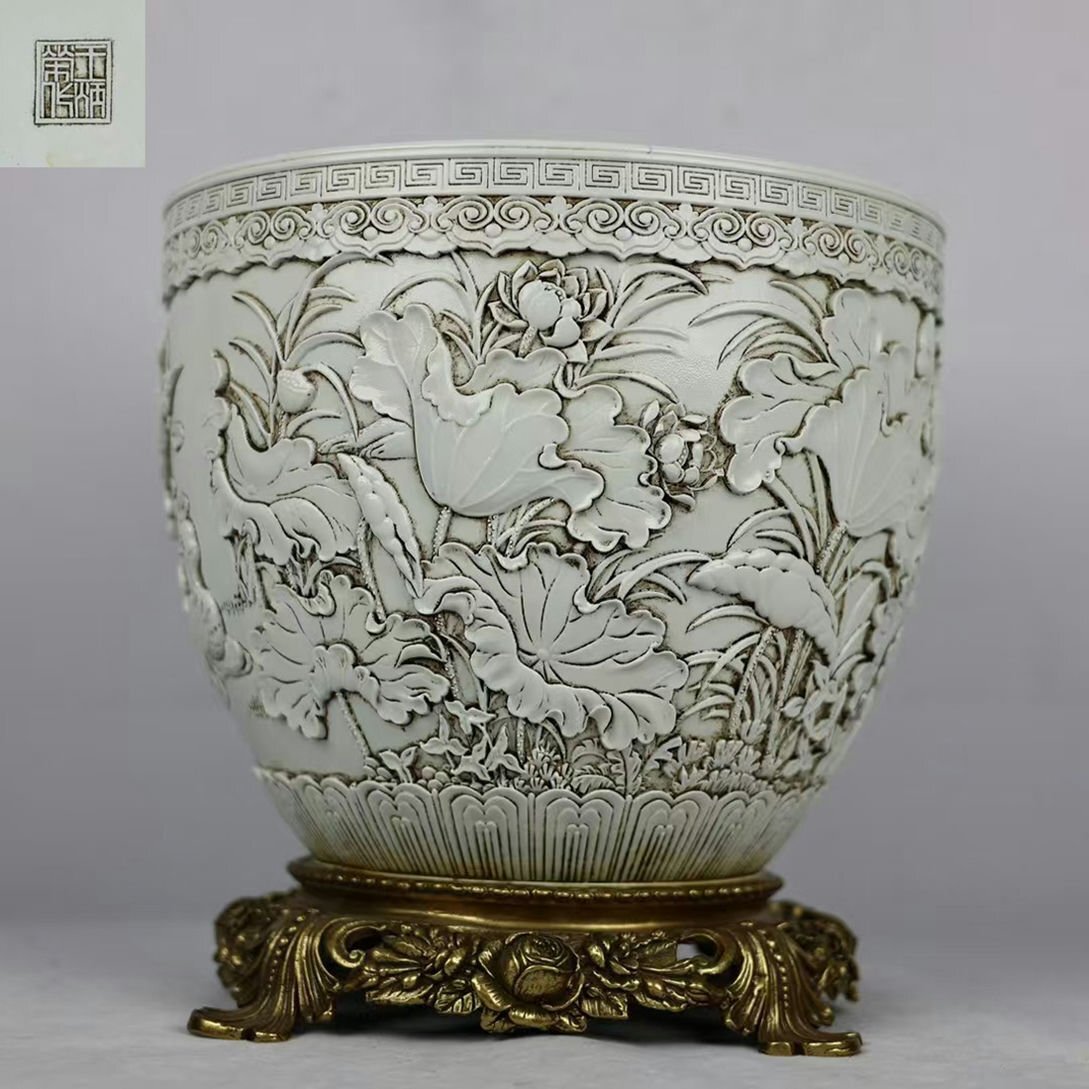 - ▼渡鶴羽▼A0753民国 王炳榮 彫刻荷花仙鶴紋象嵌銅底蓮子缸・古陶磁器 ・珍品旧蔵・古賞物・時代物