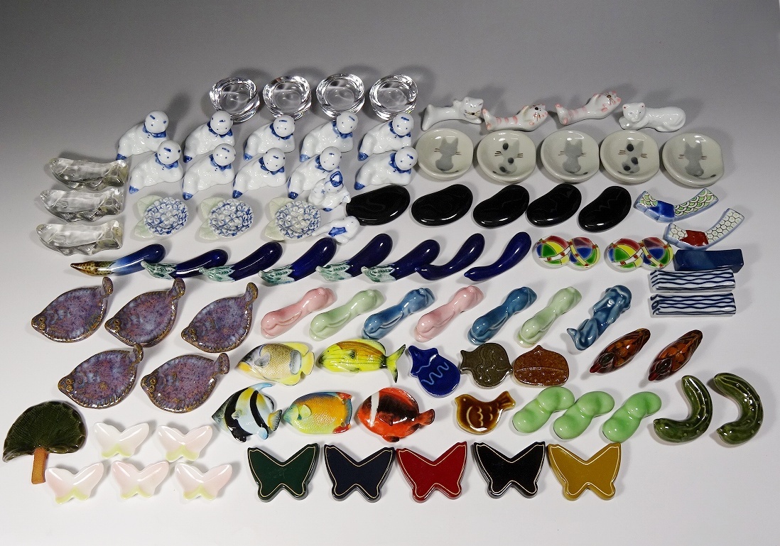 - 6941■箸置き 大量 まとめ 90点 在銘 和食器 野菜 動物 魚 猫 陶器 ガラス 木製 懐石道具 箸枕