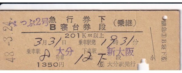 - 鉄道切符 硬券 べっぷ 急行券/B寝台券(乗継) 大分→新大阪