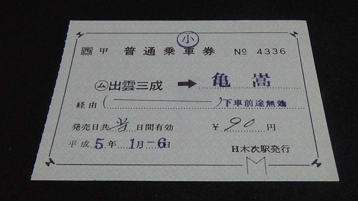 - □西 軟券 補充片道券【木次線】ム出雲三成→ 亀嵩 小 5-1.6 H木次駅発行