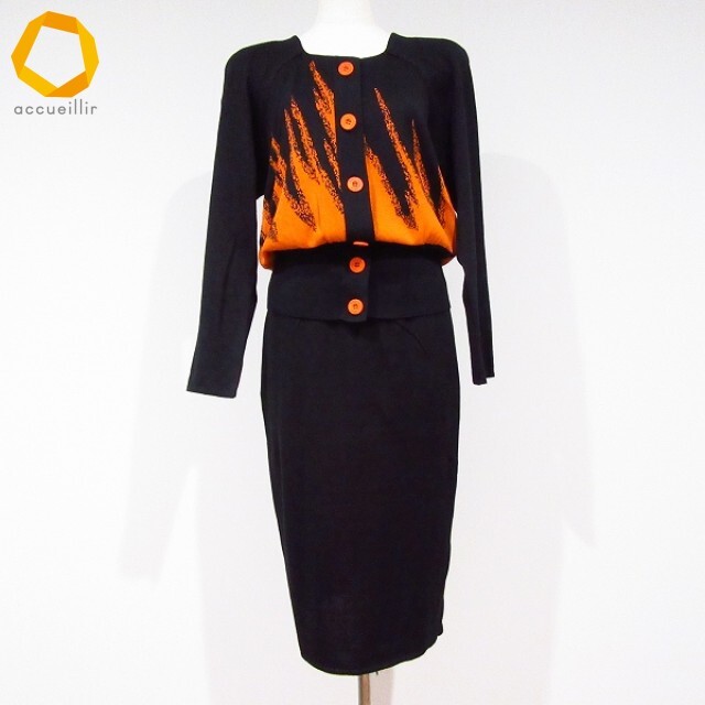 > #anc イヴサンローラン Yves Saint Laurent セットアップ ツーピース M 黒 オレンジ ニット 美品 レディース [974896]