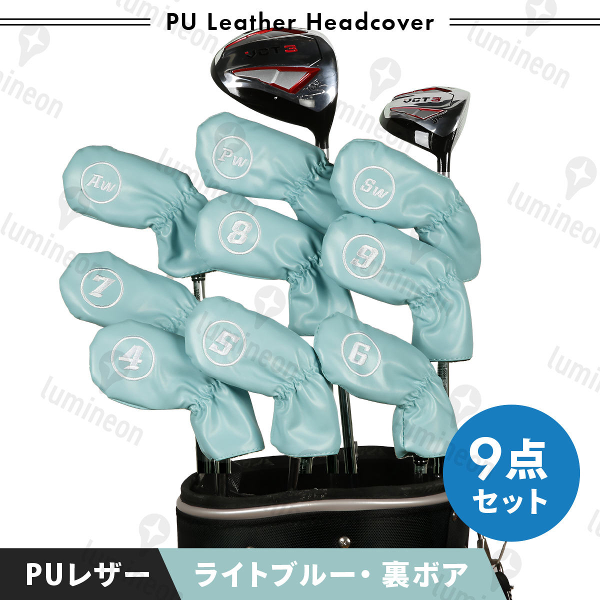 > アイアン カバー ヘッド 9点 セット ゴルフ クラブ ブルー 青 高級 レザー 裏ボア 刺繍入り 撥水 耐水 フード 番手付き シンプル g082h 2